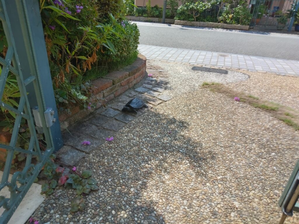 *写真は、亀さん、こっち、と呼びかけたら、振り向いて門前の帰路をたどる亀。私は彼に特別な名前を付けていない。三十六年間、いつも、ただ、カメさんカメさん、そう呼んでいる。