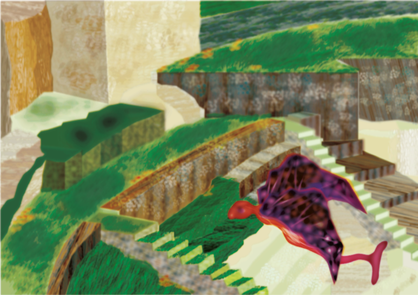 以前火山に現れた未鑑定動物を描きましたが、それがこの度とある遺跡に再出現した絵柄を描きました。