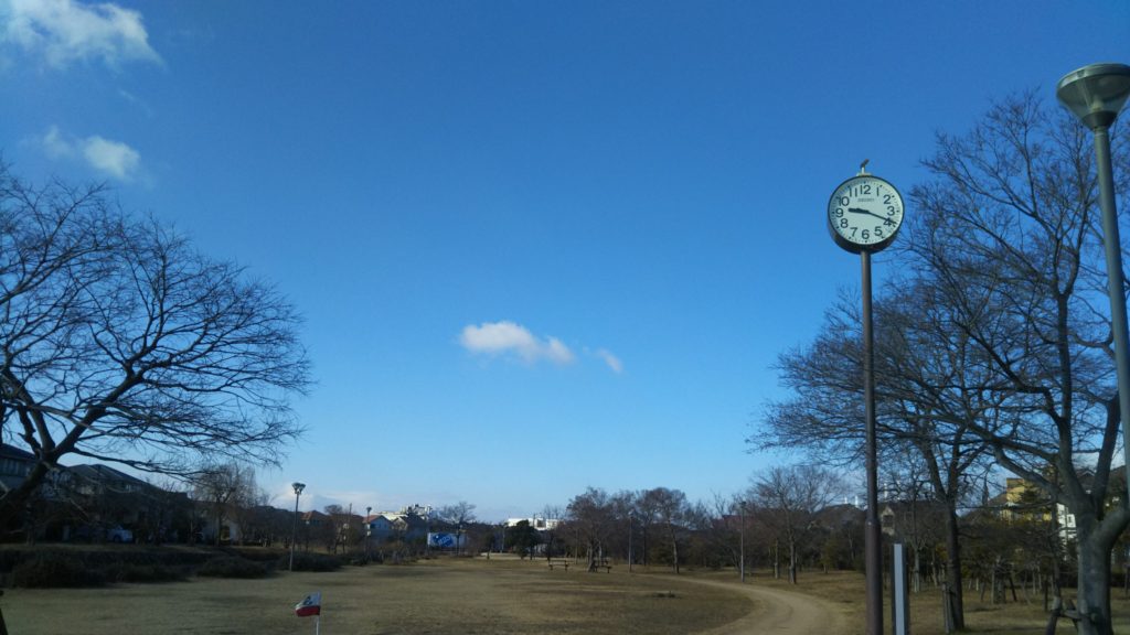 *写真は、一月二十日午前九時十九分、親水公園のポール時計と樹木の間に浮かぶ雲を、スマホで私が撮った。