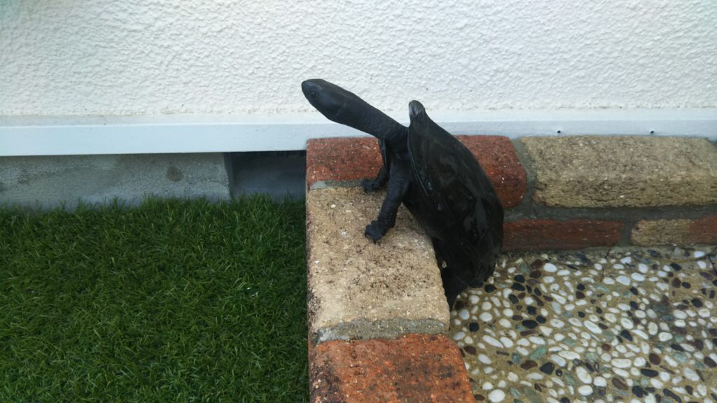 *写真は。体をキレイに洗われた後、洗い場で遊びながらレンガの囲いを越えてベランダの人工芝の方へ移動しようとしている亀さんです。