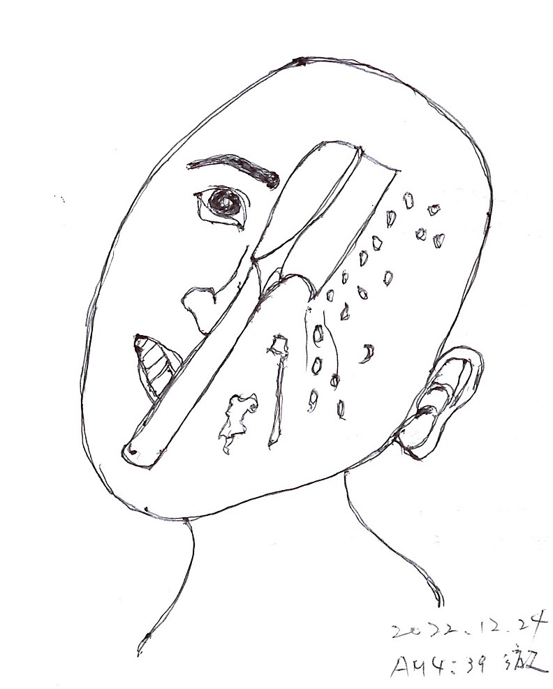 そうだったのかなア、先程も水を飲もうとして手が動かなかったのもそれだったんだなア。ソウソウ、例えば、思い出しました。ほんの一例ですが、午後三時ごろに歯を磨いていて、『オヤオヤ、今頃になって何故オレは歯なんぞ磨いているのカイ?』……読者もおそらくこんな経験をお持ちでしょうネ。そうでした、まったくもってやりたい放題、カユクもないのに頭をかいてみたり、おかしくないのに笑ってみたり、相手の話を聞いてもいないのに真顔で聞いてるフリしてウンウンしてみたり、とマアそういった経験が我が物顔で、次から次へと頭の中を疾駆したのです。イヤな思い出が走り回っているじゃアありませんか。そうかイ、そうだったのかイ、さっきも水を飲もうとして手が動かなかったのもそれなんだなア、きっとそれなんだよなア……。