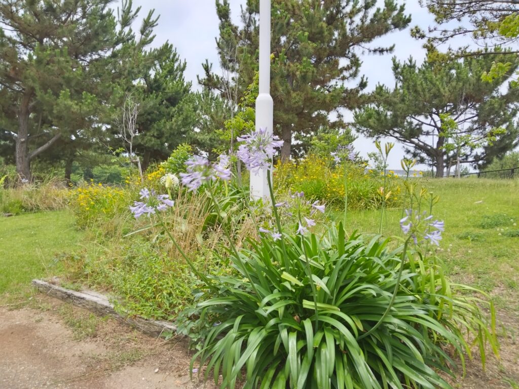 *写真は、総合公園の南側の一角に咲く花。年配の女性が一人でお花畑の世話をしている。無償で。