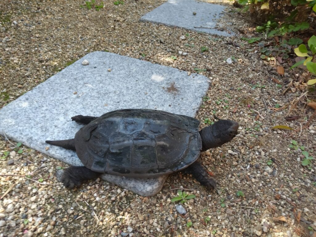 *写真は、冬眠から目覚め、庭を放浪する亀。