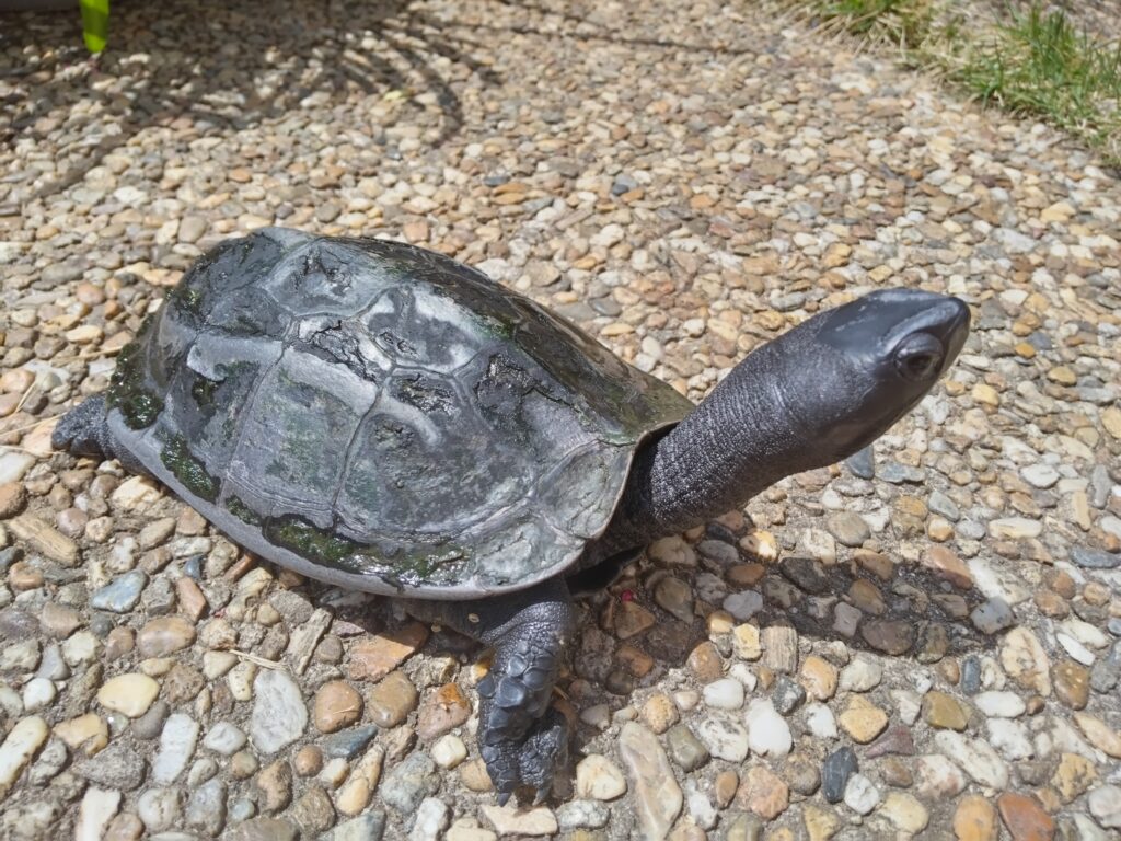 *写真は、我が家のアプローチをのっそり歩いている亀。