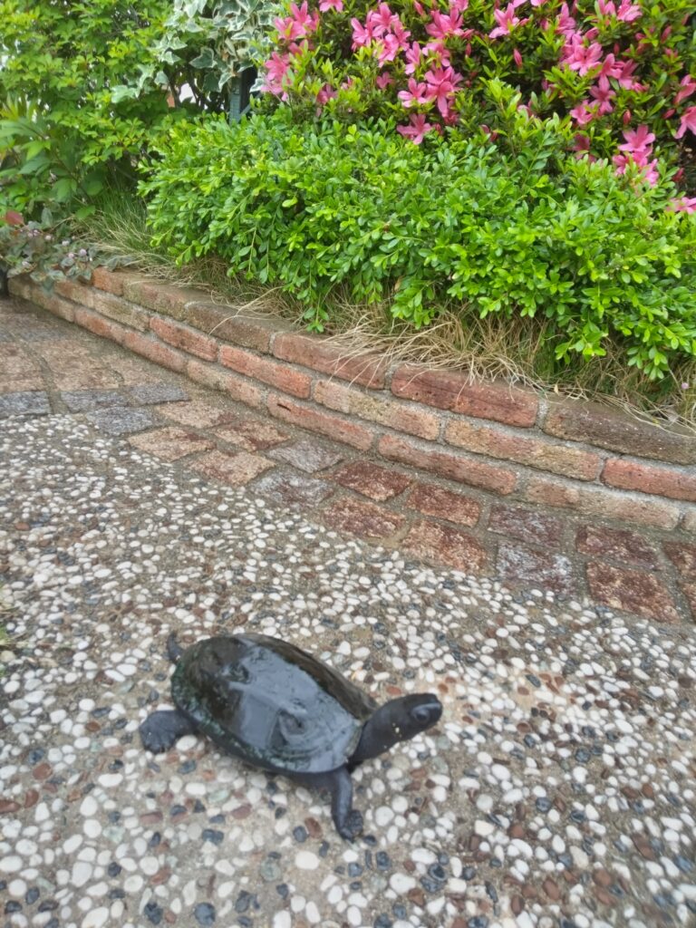 *写真は、我が家の門前に咲き始めたサツキの前を散歩している亀。ツツジはしぼみ、サツキは開花していた。