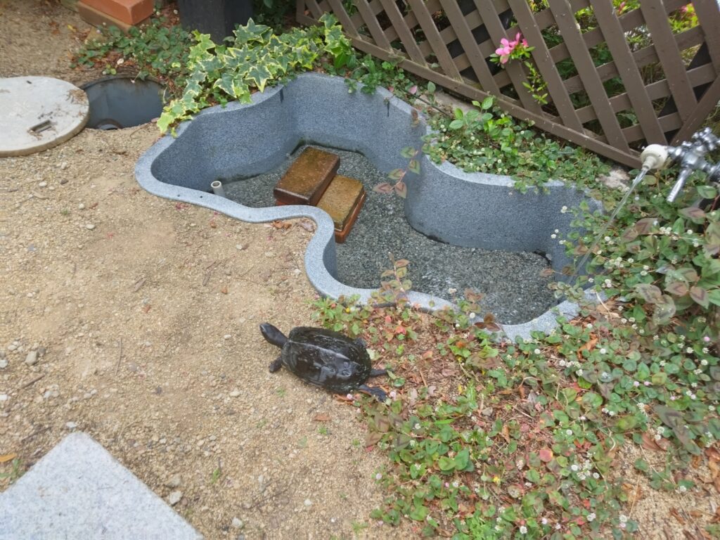 *写真は、庭の小さな池の周りで遊ぶ亀。きょうはいつもより動きが鈍い。亀も体調不良なのだろうか。