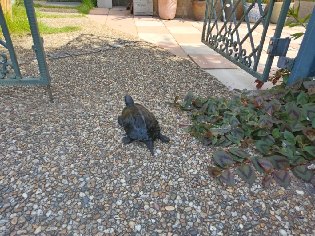*写真は、垣根沿いの路上でさんざん遊んだあげく、我が家の門へ向かう亀。どこか私に似ている。