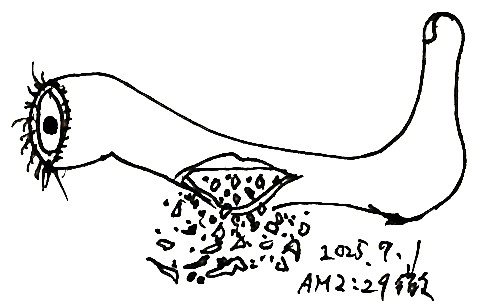 そこには二十センチ大の唇が開いていて、赤い仁丹に似たおびただしい玉が混ざった濃緑色の愛液を垂れ流し続けていた。どろり、どくどく、どっくん……こんな不気味な連続音がした。どうぞここから入ってください。お願い、どうぞここから……何度も同じフレーズを語りかけてくる。意識の絶えた闇男の深底にこのフレーズだけが永遠に反復するのだった。