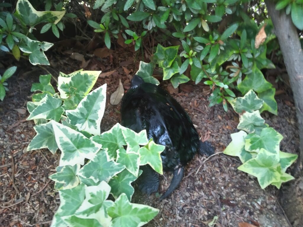 *写真は、垣根の下にもぐろうとする亀。今年一番、元気だった。作業中、庭をあちらこちら歩き回った。どこかの下に潜り込んでしまうと見つけるのに一苦労。まして垣根の下に潜り込んで道路にまで飛び出したら大変!