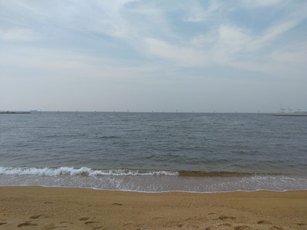 *写真は、七月最初の日曜日の芦屋浜。波が少し荒い。