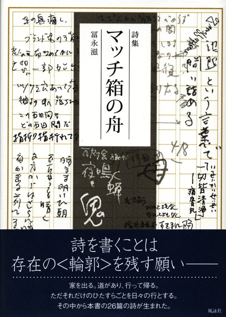 本書「マッチ箱の舟」の成立のいきさつは詩人の妻冨永多津子が書いた「編集後記」に詳しい。著者は2015年に永眠しているが、この詩集は晩年、六年前後にわたる作品集成だった。