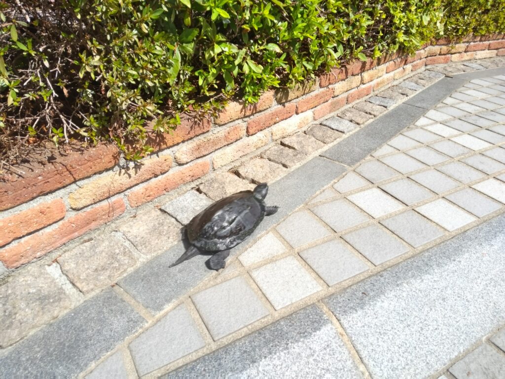 *写真は、我が家の垣根の前の路上を散歩する亀。池の掃除が終わるといつも亀と私はこうして一緒に遊んでいる。