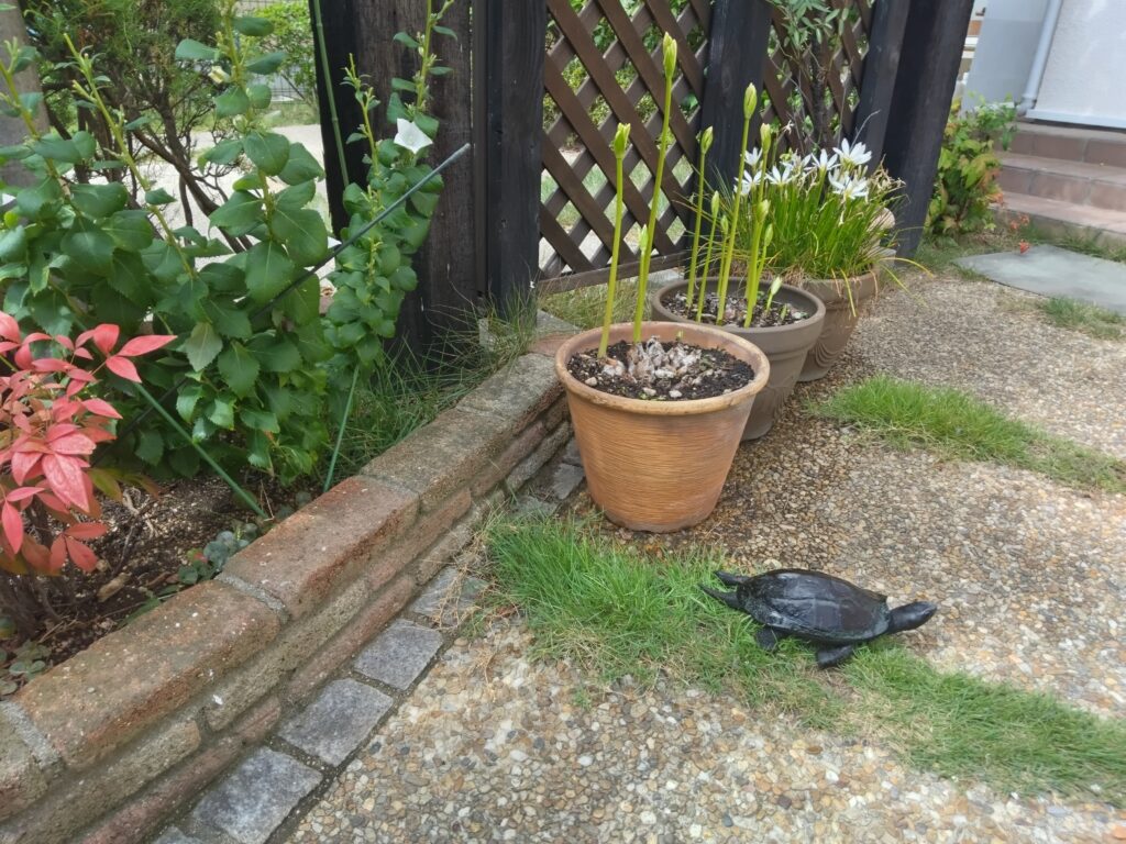 *写真は、庭で遊ぶ亀。彼の背後の左に、もう時期を終えんとするキキョウ、右には芽ぐみ出しておそらくこの二三日で開花する彼岸花。我が家のキキョウも彼岸花も白。亡妻の好みに違いない。