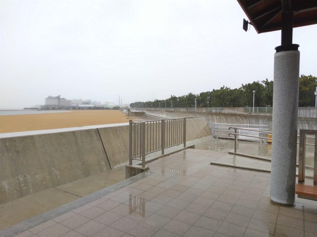 *写真は、雨の芦屋浜。東北端にある東屋から西に向かって浜と堤防を撮った。午後一時前。かなり激しい雨の中、門を出た。古靴の中の足まで濡れていた。