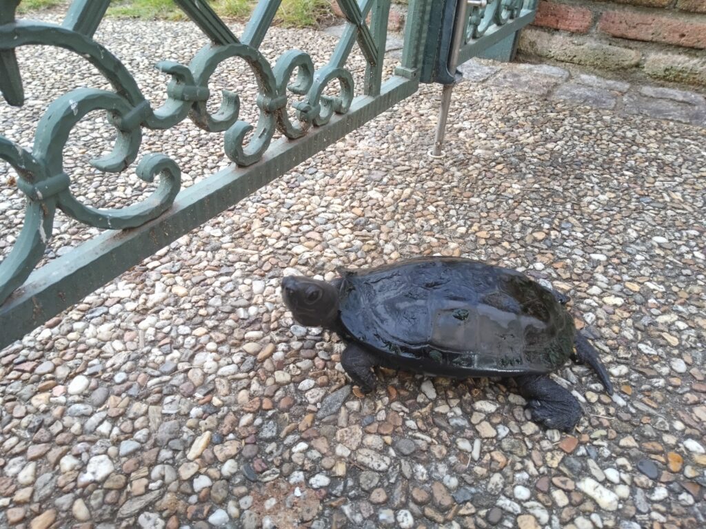 *写真は、我が家の門の下をくぐって、表に出ようとしている亀。私の方を振り返って、おまえもついて来い、催促している。