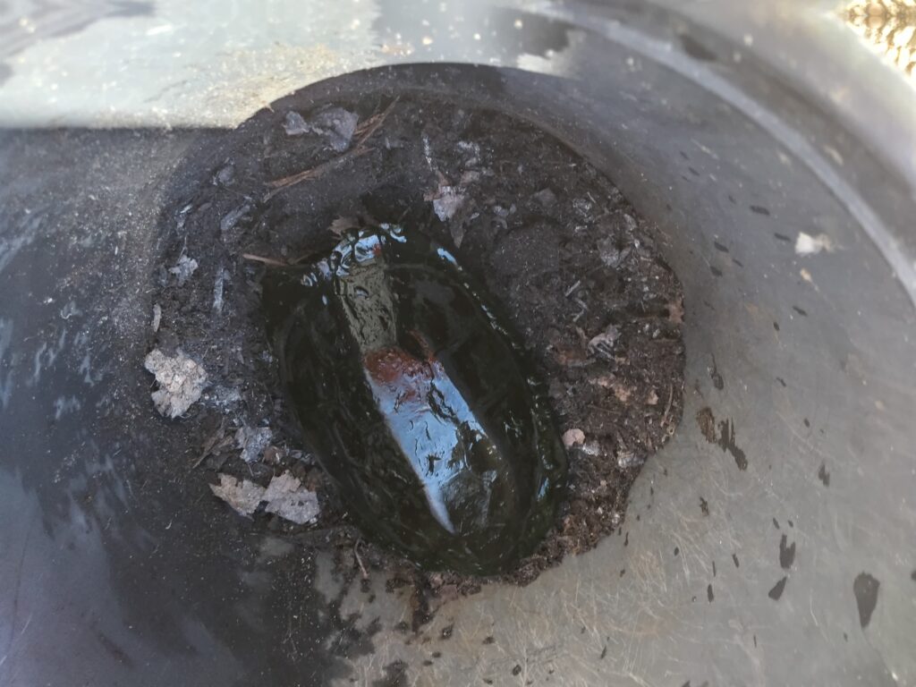 *写真は、バケツの中の腐葉土の上でじっとしている亀。おそらく数時間後には腐葉土の中にもぐって冬眠する。願わくば、おたがい、来年の春まで。