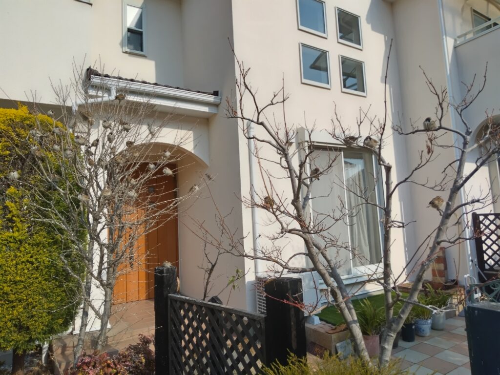 朝九時過ぎ、一階のダイニングからリビングへ、そして寝室へとシャッターをあげていくと、スズメたちが眼前を飛び交ったりして、空中を夢中で飛び回ったりして、朝ごはんの催促。