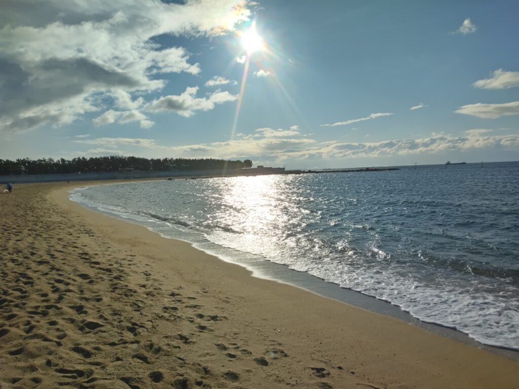 *写真は、雪の後、晴れ間が出た芦屋浜。きょうの日曜日は雪と浜の太陽をほぼ同時に見れた不思議な朝だった。