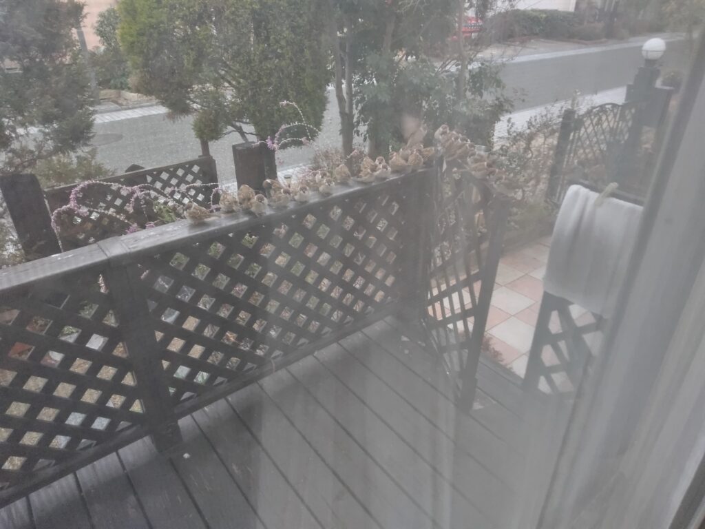 朝八時ごろ、ダイニングのガラス戸越しに見ると、ウッドデッキの手すりにスズメたちが止まっている。朝ごはんを待っている。そんな彼らの姿を私はスマホに収めた。