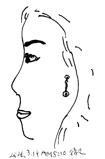 眉毛はない。剃り落してしまったのか。眉墨で黒い三日月の線を描いている。瞳の上に妖しく弓なりに反りかえるまつ毛。顔全体はおしろいの皮を被せて。紅だけではない。紫やピンクになったり、さまざまな色に濡れる唇。両耳には繊細な金色の鎖状のイヤリングがぶら下がり。髪型も髪の色も、会うたびに変形したり紫やら緑やらブロンドに変色してみたり。